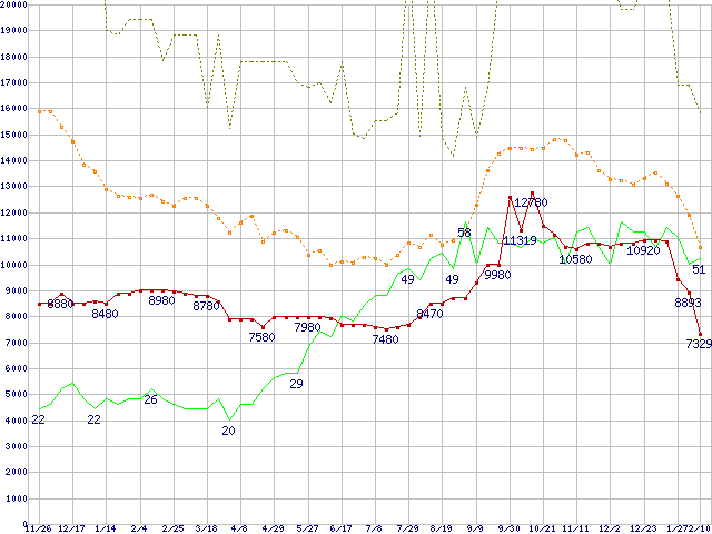 ※このグラフは過去のデータも税率5%相当に調整した税込み相当額のグラフです。 税率変更や、総額表示方式導入(2004年4月)の影響は除いています。 | | | ●凡例 | 最安値 (点線部は販売店未確認 または未調査) | 平均値 | 最高値 | ショップ数 |