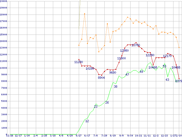 ※このグラフは過去のデータも税率5%相当に調整した税込み相当額のグラフです。 税率変更や、総額表示方式導入(2004年4月)の影響は除いています。 | | | ●凡例 | 最安値 (点線部は販売店未確認 または未調査) | 平均値 | 最高値 | ショップ数 |