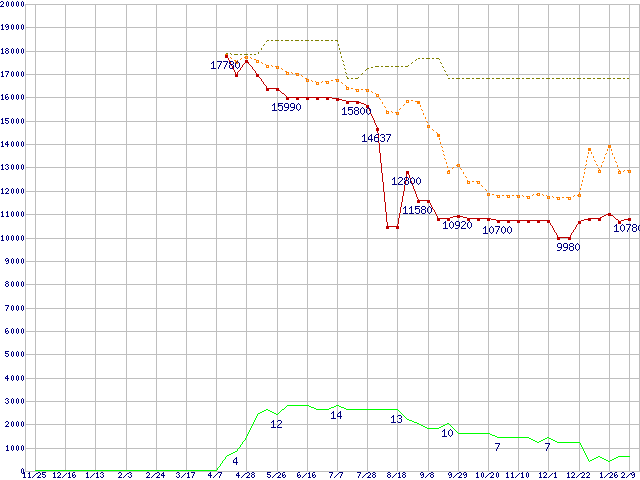 ※このグラフは過去のデータも税率5%相当に調整した税込み相当額のグラフです。 税率変更や、総額表示方式導入(2004年4月)の影響は除いています。 | | | ●凡例 | 最安値 (点線部は販売店未確認 または未調査) | 平均値 | 最高値 | ショップ数 |