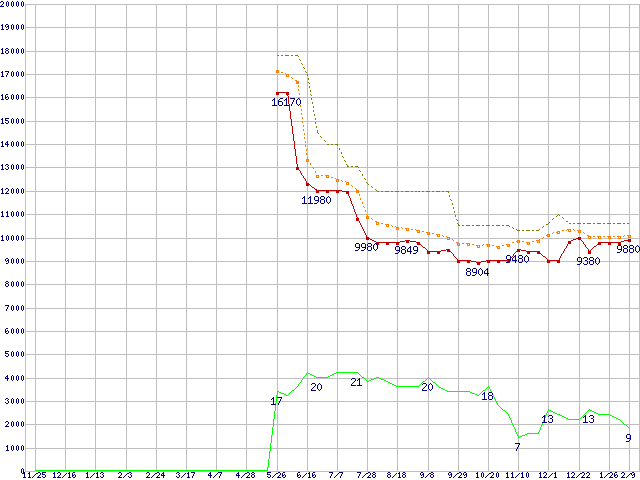 ※このグラフは過去のデータも税率5%相当に調整した税込み相当額のグラフです。 税率変更や、総額表示方式導入(2004年4月)の影響は除いています。 | | | ●凡例 | 最安値 (点線部は販売店未確認 または未調査) | 平均値 | 最高値 | ショップ数 |