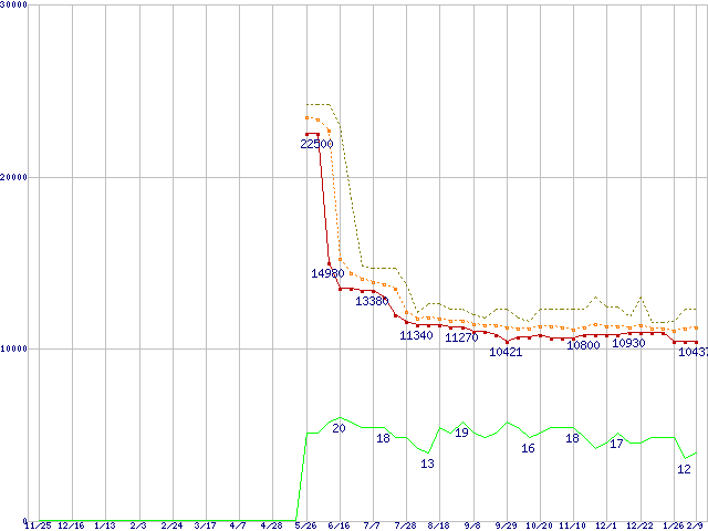 ※このグラフは過去のデータも税率5%相当に調整した税込み相当額のグラフです。 税率変更や、総額表示方式導入(2004年4月)の影響は除いています。 | | | ●凡例 | 最安値 (点線部は販売店未確認 または未調査) | 平均値 | 最高値 | ショップ数 |