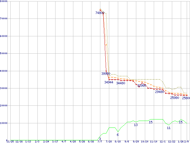 | Athlon 64 X2 4600+ (2.4GHz,L2 512KB×2,TDP65W)の価格推移 | | | (2005年11月25日~2007年2月9日) |