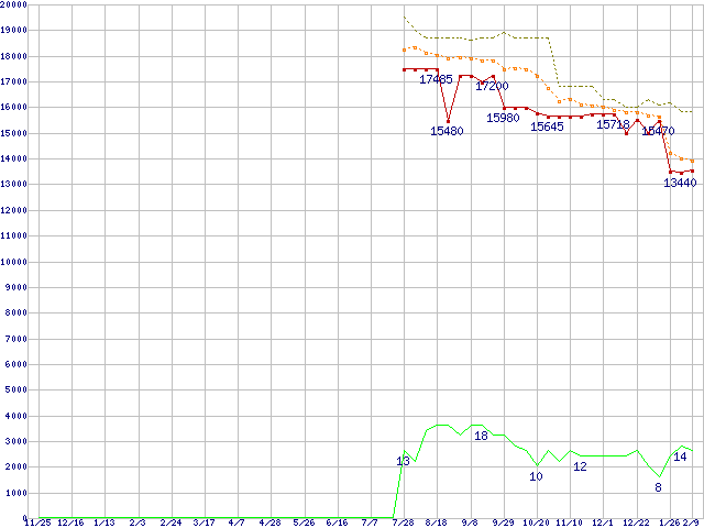 ※このグラフは過去のデータも税率5%相当に調整した税込み相当額のグラフです。 税率変更や、総額表示方式導入(2004年4月)の影響は除いています。 | | | ●凡例 | 最安値 (点線部は販売店未確認 または未調査) | 平均値 | 最高値 | ショップ数 |