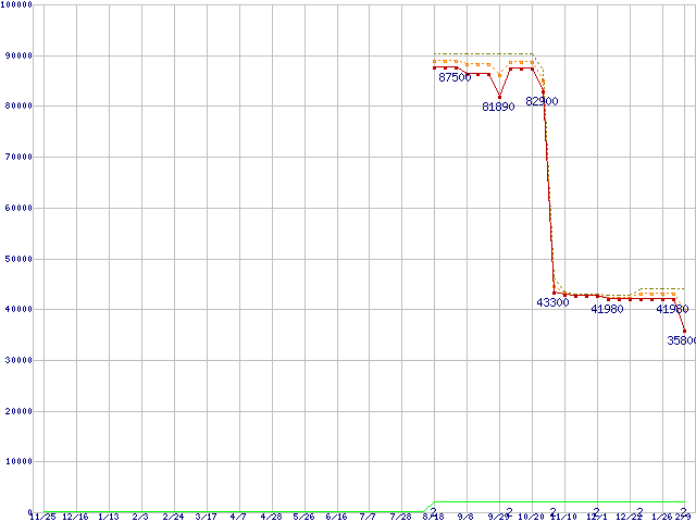 ※このグラフは過去のデータも税率5%相当に調整した税込み相当額のグラフです。 税率変更や、総額表示方式導入(2004年4月)の影響は除いています。 | | | ●凡例 | 最安値 (点線部は販売店未確認 または未調査) | 平均値 | 最高値 | ショップ数 |