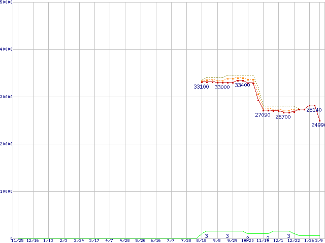 ※このグラフは過去のデータも税率5%相当に調整した税込み相当額のグラフです。 税率変更や、総額表示方式導入(2004年4月)の影響は除いています。 | | | ●凡例 | 最安値 (点線部は販売店未確認 または未調査) | 平均値 | 最高値 | ショップ数 |