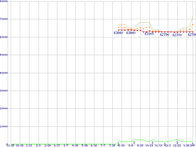 ※このグラフは過去のデータも税率5%相当に調整した税込み相当額のグラフです。 税率変更や、総額表示方式導入(2004年4月)の影響は除いています。 | | | ●凡例 | 最安値 (点線部は販売店未確認 または未調査) | 平均値 | 最高値 | ショップ数 |