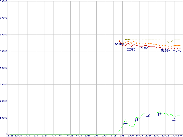 | Core 2 Duo T7400 (2.16GHz,L2 4MB)の価格推移 | | | (2005年11月25日~2007年2月9日) |
