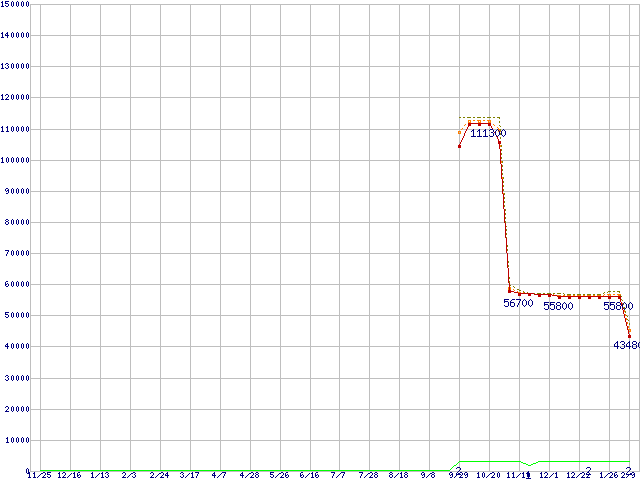 ※このグラフは過去のデータも税率5%相当に調整した税込み相当額のグラフです。 税率変更や、総額表示方式導入(2004年4月)の影響は除いています。 | | | ●凡例 | 最安値 (点線部は販売店未確認 または未調査) | 平均値 | 最高値 | ショップ数 |