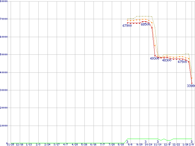 ※このグラフは過去のデータも税率5%相当に調整した税込み相当額のグラフです。 税率変更や、総額表示方式導入(2004年4月)の影響は除いています。 | | | ●凡例 | 最安値 (点線部は販売店未確認 または未調査) | 平均値 | 最高値 | ショップ数 |