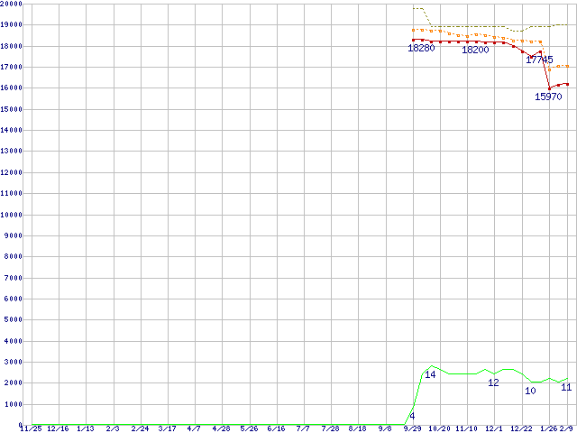 ※このグラフは過去のデータも税率5%相当に調整した税込み相当額のグラフです。 税率変更や、総額表示方式導入(2004年4月)の影響は除いています。 | | | ●凡例 | 最安値 (点線部は販売店未確認 または未調査) | 平均値 | 最高値 | ショップ数 |