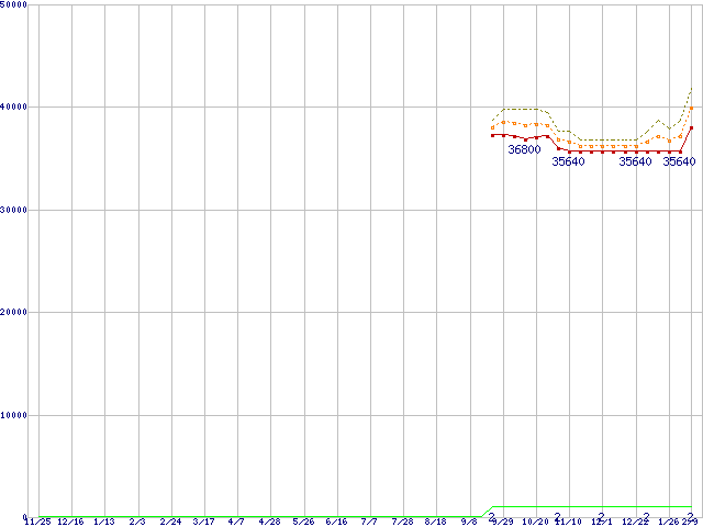 ※このグラフは過去のデータも税率5%相当に調整した税込み相当額のグラフです。 税率変更や、総額表示方式導入(2004年4月)の影響は除いています。 | | | ●凡例 | 最安値 (点線部は販売店未確認 または未調査) | 平均値 | 最高値 | ショップ数 |