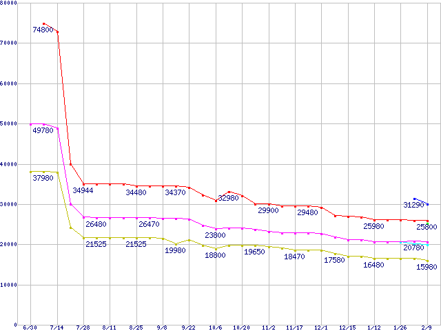 | Socket AM2 (FSB 1000MHz,Dual Core,TDP65W)の最安値推移 | | | (2006年6月30日~2007年2月9日) |