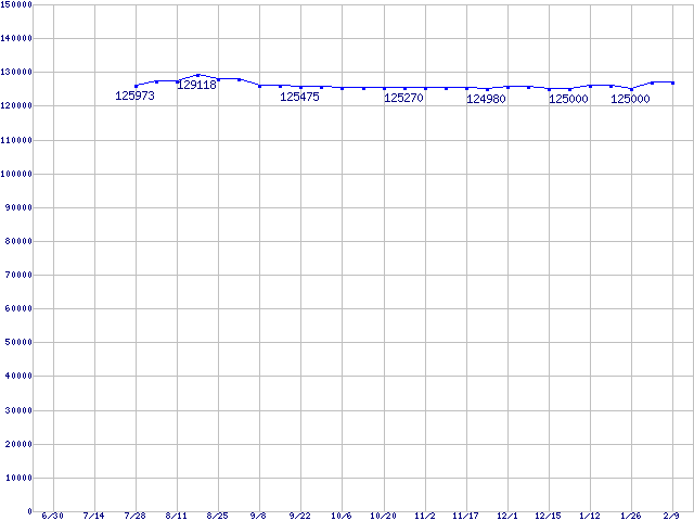| LGA775 (FSB 1066MHz,L2 4MB,Dual Core,EM64T対応,TDP 75W)の最安値推移 | | | (2006年6月30日~2007年2月9日) |