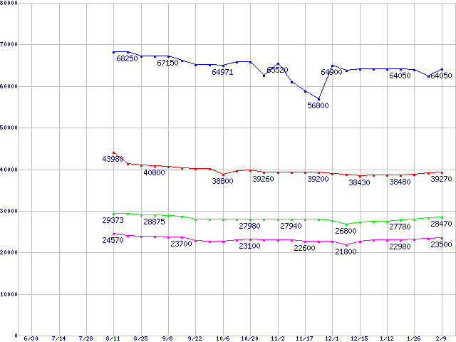 | LGA775 (FSB 1066MHz,Dual Core,EM64T対応,TDP 65W)の最安値推移 | | | (2006年6月30日~2007年2月9日) |