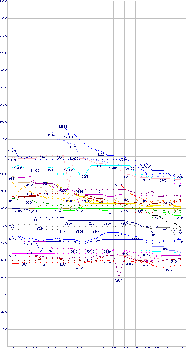 | HDD主要製品(最安値1万円未満)の最安値推移 | | | (2006年7月6日~2007年2月15日) |