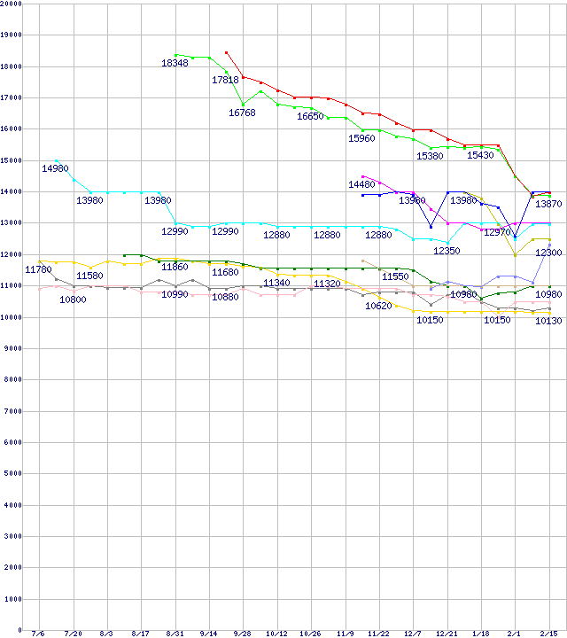 HDD主要製品(最安値1万5千円~2万円未満)の最安値推移