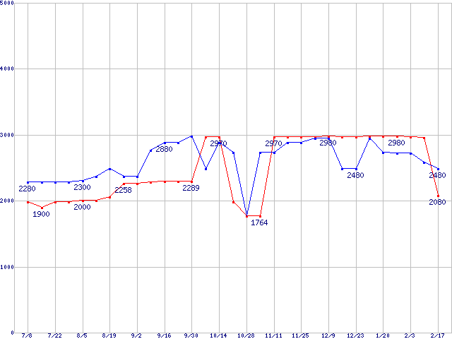 メモリ主要製品(最安値5千円未満)の最安値推移