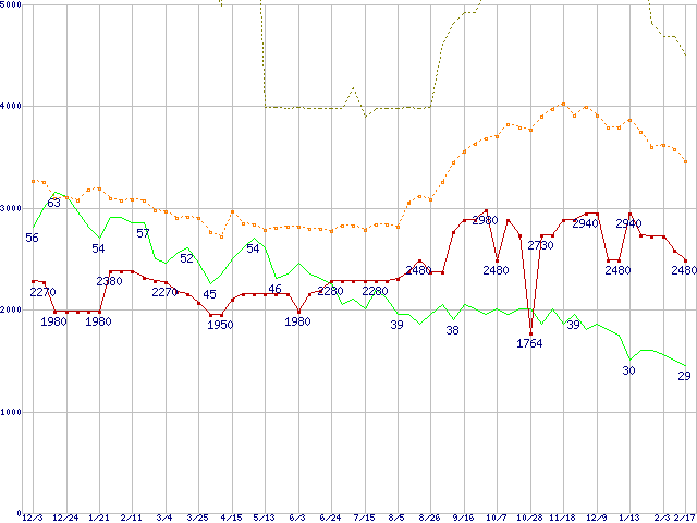 ※このグラフは過去のデータも税率5%相当に調整した税込み相当額のグラフです。 税率変更や、総額表示方式導入(2004年4月)の影響は除いています。 | | | ●凡例 | 最安値 (点線部は販売店未確認 または未調査) | 平均値 | 最高値 | ショップ数 |