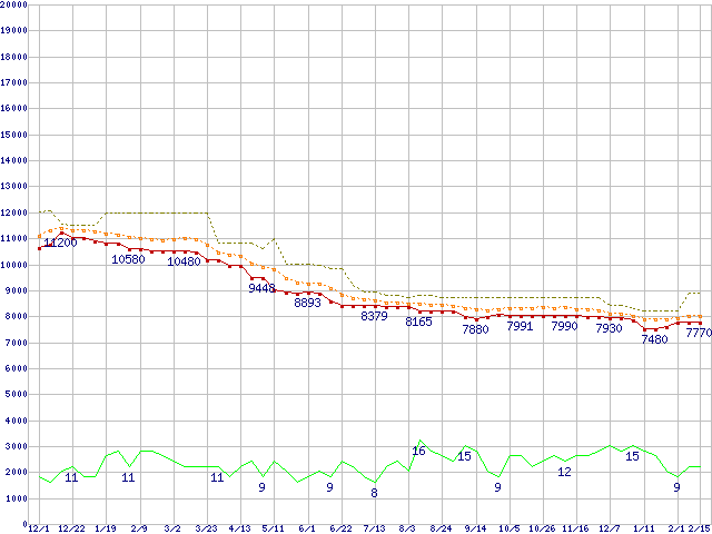 ※このグラフは過去のデータも税率5%相当に調整した税込み相当額のグラフです。 税率変更や、総額表示方式導入(2004年4月)の影響は除いています。 | | | ●凡例 | 最安値 (点線部は販売店未確認 または未調査) | 平均値 | 最高値 | ショップ数 |