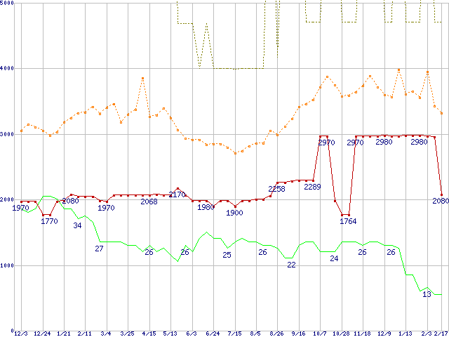 ※このグラフは過去のデータも税率5%相当に調整した税込み相当額のグラフです。 税率変更や、総額表示方式導入(2004年4月)の影響は除いています。 | | | ●凡例 | 最安値 (点線部は販売店未確認 または未調査) | 平均値 | 最高値 | ショップ数 |