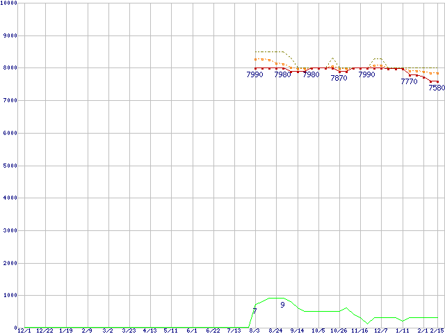 ※このグラフは過去のデータも税率5%相当に調整した税込み相当額のグラフです。 税率変更や、総額表示方式導入(2004年4月)の影響は除いています。 | | | ●凡例 | 最安値 (点線部は販売店未確認 または未調査) | 平均値 | 最高値 | ショップ数 |