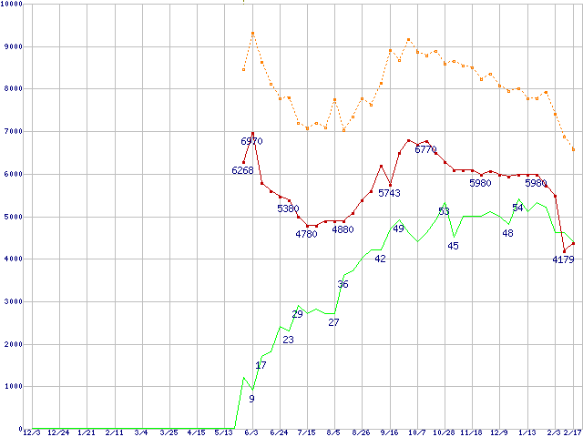 ※このグラフは過去のデータも税率5%相当に調整した税込み相当額のグラフです。 税率変更や、総額表示方式導入(2004年4月)の影響は除いています。 | | | ●凡例 | 最安値 (点線部は販売店未確認 または未調査) | 平均値 | 最高値 | ショップ数 |