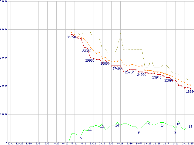 ※このグラフは過去のデータも税率5%相当に調整した税込み相当額のグラフです。 税率変更や、総額表示方式導入(2004年4月)の影響は除いています。 | | | ●凡例 | 最安値 (点線部は販売店未確認 または未調査) | 平均値 | 最高値 | ショップ数 |