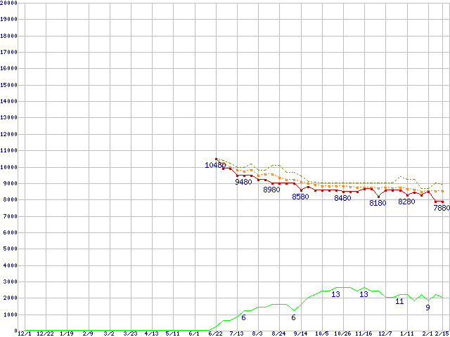 ※このグラフは過去のデータも税率5%相当に調整した税込み相当額のグラフです。 税率変更や、総額表示方式導入(2004年4月)の影響は除いています。 | | | ●凡例 | 最安値 (点線部は販売店未確認 または未調査) | 平均値 | 最高値 | ショップ数 |