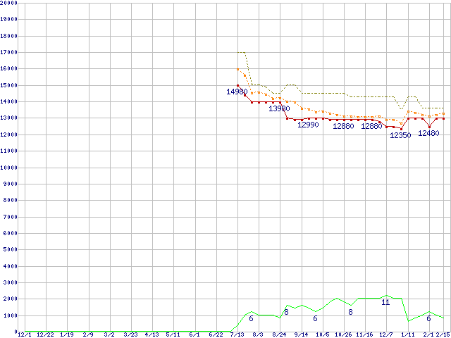 ※このグラフは過去のデータも税率5%相当に調整した税込み相当額のグラフです。 税率変更や、総額表示方式導入(2004年4月)の影響は除いています。 | | | ●凡例 | 最安値 (点線部は販売店未確認 または未調査) | 平均値 | 最高値 | ショップ数 |
