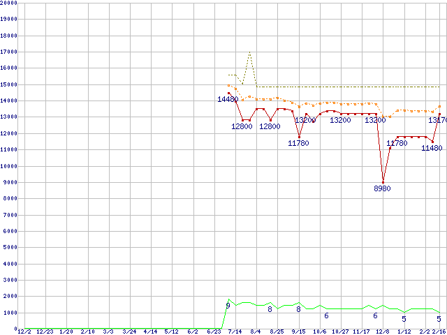 ※このグラフは過去のデータも税率5%相当に調整した税込み相当額のグラフです。 税率変更や、総額表示方式導入(2004年4月)の影響は除いています。 | | | ●凡例 | 最安値 (点線部は販売店未確認 または未調査) | 平均値 | 最高値 | ショップ数 |