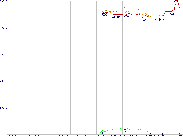 ※このグラフは過去のデータも税率5%相当に調整した税込み相当額のグラフです。 税率変更や、総額表示方式導入(2004年4月)の影響は除いています。 | | | ●凡例 | 最安値 (点線部は販売店未確認 または未調査) | 平均値 | 最高値 | ショップ数 |