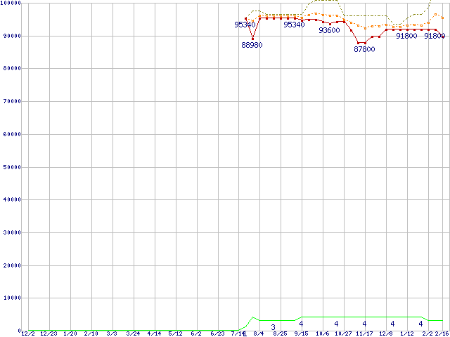 ※このグラフは過去のデータも税率5%相当に調整した税込み相当額のグラフです。 税率変更や、総額表示方式導入(2004年4月)の影響は除いています。 | | | ●凡例 | 最安値 (点線部は販売店未確認 または未調査) | 平均値 | 最高値 | ショップ数 |