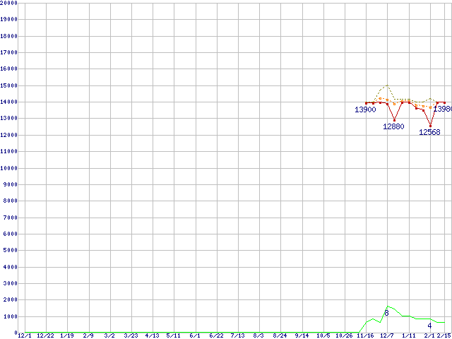 ※このグラフは過去のデータも税率5%相当に調整した税込み相当額のグラフです。 税率変更や、総額表示方式導入(2004年4月)の影響は除いています。 | | | ●凡例 | 最安値 (点線部は販売店未確認 または未調査) | 平均値 | 最高値 | ショップ数 |