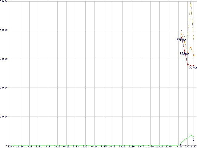 ※このグラフは過去のデータも税率5%相当に調整した税込み相当額のグラフです。 税率変更や、総額表示方式導入(2004年4月)の影響は除いています。 | | | ●凡例 | 最安値 (点線部は販売店未確認 または未調査) | 平均値 | 最高値 | ショップ数 |