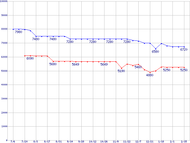 | Barracuda 7200.9 (7200rpm,SATA 3Gb/s,Low Profile)の最安値推移 | | | (2006年7月6日~2007年2月15日) |