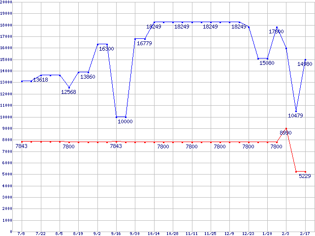 | PC3200(DDR400) DDR SDRAM DIMM ECC対応 Registeredタイプの最安値推移 | | | (2006年7月8日~2007年2月17日) |