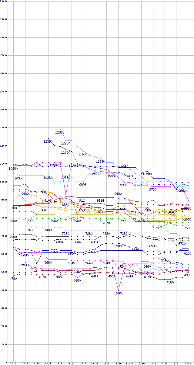 | HDD主要製品(最安値1万円未満)の最安値推移 | | | (2006年7月13日~2007年2月22日) |