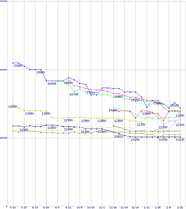 HDD主要製品(最安値1万5千円~2万円未満)の最安値推移