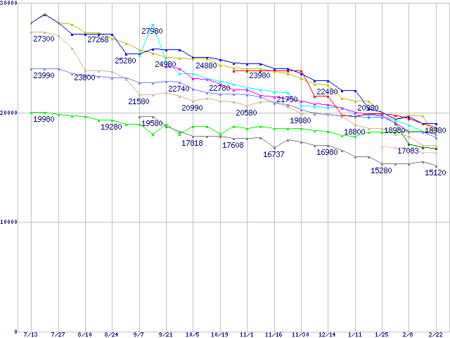 HDD主要製品(最安値1万5千円~2万円未満)の最安値推移