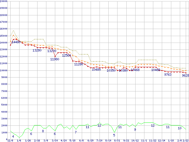 ※このグラフは過去のデータも税率5%相当に調整した税込み相当額のグラフです。 税率変更や、総額表示方式導入(2004年4月)の影響は除いています。 | | | ●凡例 | 最安値 (点線部は販売店未確認 または未調査) | 平均値 | 最高値 | ショップ数 |