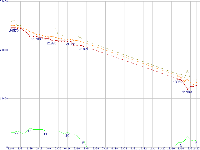 ※このグラフは過去のデータも税率5%相当に調整した税込み相当額のグラフです。 税率変更や、総額表示方式導入(2004年4月)の影響は除いています。 | | | ●凡例 | 最安値 (点線部は販売店未確認 または未調査) | 平均値 | 最高値 | ショップ数 |