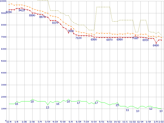 ※このグラフは過去のデータも税率5%相当に調整した税込み相当額のグラフです。 税率変更や、総額表示方式導入(2004年4月)の影響は除いています。 | | | ●凡例 | 最安値 (点線部は販売店未確認 または未調査) | 平均値 | 最高値 | ショップ数 |