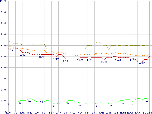 ※このグラフは過去のデータも税率5%相当に調整した税込み相当額のグラフです。 税率変更や、総額表示方式導入(2004年4月)の影響は除いています。 | | | ●凡例 | 最安値 (点線部は販売店未確認 または未調査) | 平均値 | 最高値 | ショップ数 |