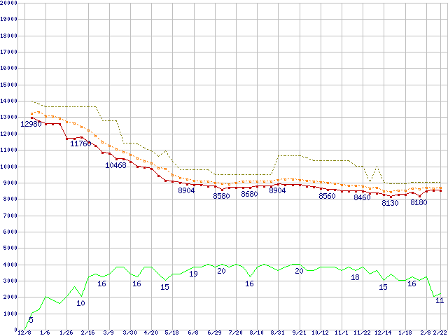 ※このグラフは過去のデータも税率5%相当に調整した税込み相当額のグラフです。 税率変更や、総額表示方式導入(2004年4月)の影響は除いています。 | | | ●凡例 | 最安値 (点線部は販売店未確認 または未調査) | 平均値 | 最高値 | ショップ数 |