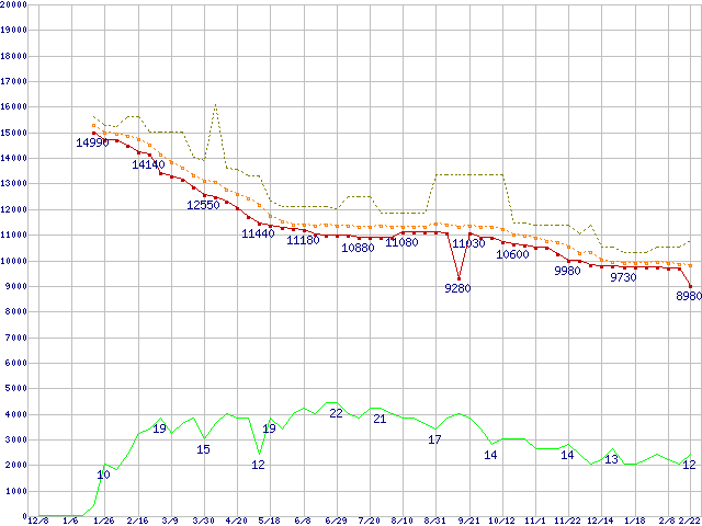 ※このグラフは過去のデータも税率5%相当に調整した税込み相当額のグラフです。 税率変更や、総額表示方式導入(2004年4月)の影響は除いています。 | | | ●凡例 | 最安値 (点線部は販売店未確認 または未調査) | 平均値 | 最高値 | ショップ数 |