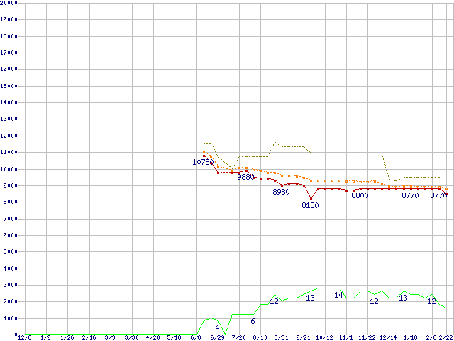 ※このグラフは過去のデータも税率5%相当に調整した税込み相当額のグラフです。 税率変更や、総額表示方式導入(2004年4月)の影響は除いています。 | | | ●凡例 | 最安値 (点線部は販売店未確認 または未調査) | 平均値 | 最高値 | ショップ数 |