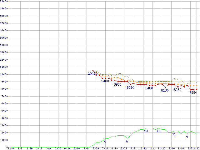 ※このグラフは過去のデータも税率5%相当に調整した税込み相当額のグラフです。 税率変更や、総額表示方式導入(2004年4月)の影響は除いています。 | | | ●凡例 | 最安値 (点線部は販売店未確認 または未調査) | 平均値 | 最高値 | ショップ数 |