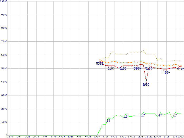 ※このグラフは過去のデータも税率5%相当に調整した税込み相当額のグラフです。 税率変更や、総額表示方式導入(2004年4月)の影響は除いています。 | | | ●凡例 | 最安値 (点線部は販売店未確認 または未調査) | 平均値 | 最高値 | ショップ数 |