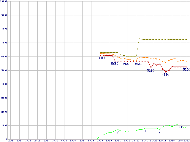 ※このグラフは過去のデータも税率5%相当に調整した税込み相当額のグラフです。 税率変更や、総額表示方式導入(2004年4月)の影響は除いています。 | | | ●凡例 | 最安値 (点線部は販売店未確認 または未調査) | 平均値 | 最高値 | ショップ数 |