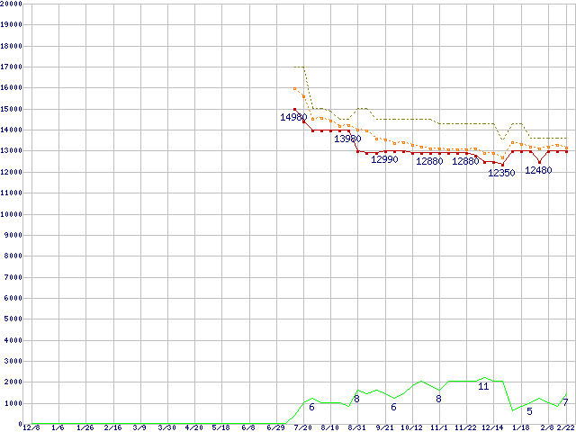 ※このグラフは過去のデータも税率5%相当に調整した税込み相当額のグラフです。 税率変更や、総額表示方式導入(2004年4月)の影響は除いています。 | | | ●凡例 | 最安値 (点線部は販売店未確認 または未調査) | 平均値 | 最高値 | ショップ数 |